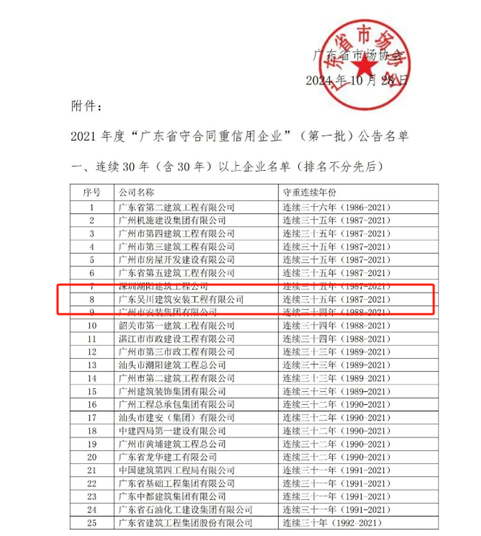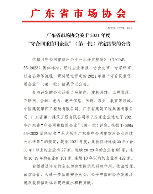 近日,廣東省市場協(xié)會發(fā)布了2021年度“守合同重信用企業(yè)”(第一批)評定結(jié)果,我公司榮耀再續(xù),連續(xù)三十五年“廣東省守合同重信用企業(yè)”稱號。獲得此榮譽(yù),不僅對公司實(shí)力的認(rèn)可,更是對誠信經(jīng)營和優(yōu)質(zhì)服務(wù)的肯定。